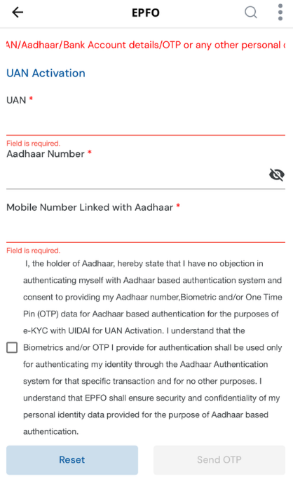 3. Enter your UAN, Aadhaar number, and registered mobile number.